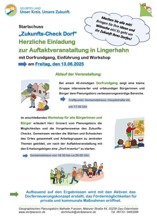 Am Freitag, den 13. Juni 2025, fällt in Lingerhahn der Startschuss für den „Zukunfts-Check Dorf“. Alle Bürgerinnen und Bürger sind herzlich zur Auftaktveranstaltung eingeladen, die mit einem Dorfrundgang, sowie einem Workshop spannende Einblicke und Mitgestaltungsmöglichkeiten bietet.