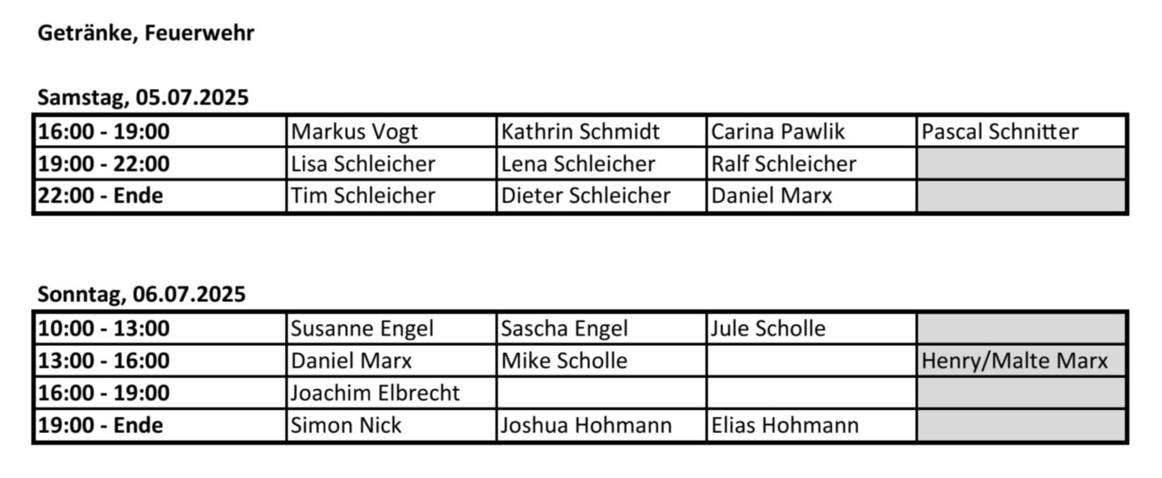 Anbei findet Ihr den aktuellen Getränke-Dienstplan. Wir suchen noch Unterstützung an den offenen Posten. Wer Zeit und Lust hat meldet sich bitte per E-Mail an Engel-Sascha86@web.de oder schreibt uns auf Facebook oder Instagram an. Vielen Dank für Eure Unterstützung!
